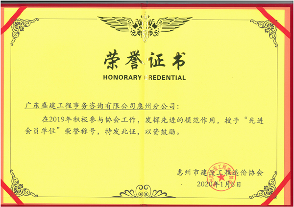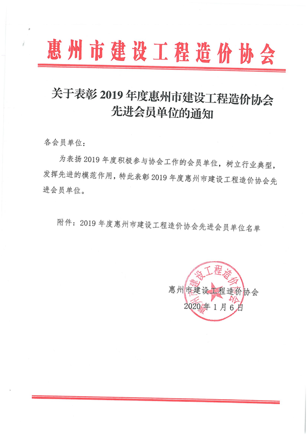 为表扬2019年度积极参与协会工作的会员单位,树立行业典型,发挥先进的模范作用,特此表彰2019年度惠州市建设工程造价协会先进会员单位。